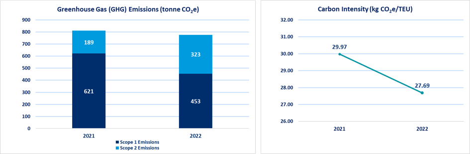 3- Carbon Intensity (kg CO2e/TEU), is the total of Scope 1 and Scope 2 GHG Emissions divided by the port’s annual throughput.